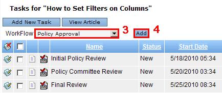- Click Add. The list of Tasks for this WorkFlow will be displayed.